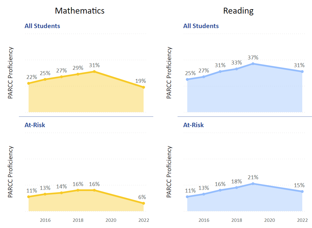 Schools are determined using the 2022 Partnership for Assessment of Readiness for College and Careers (PARCC) data and their Percent Proficient Above Expected (PPAE) calculations (using four sophisticated mathematical models) that project what percentage of students are expected to be proficient given a school’s demographics. Bold Performance Schools have proficiency rates for students at least 5.5 percentage points higher than how schools with similar demographics achieved pre-pandemic.