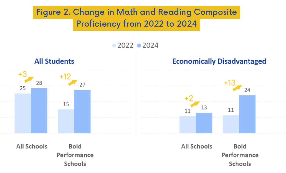 Schools are determined using the 2024 Comprehensive Assessments of Progress in Education (CAPE) data and their Percent Proficient Above Expected (PPAE) calculations (using four sophisticated models) that project what percentage of students are expected to be proficient given a school’s demographics. Bold Performance Schools have proficiency rates for students at least 10 percentage points higher in math and reading combined (PPAE of 10+) than how schools with similar demographics performed.